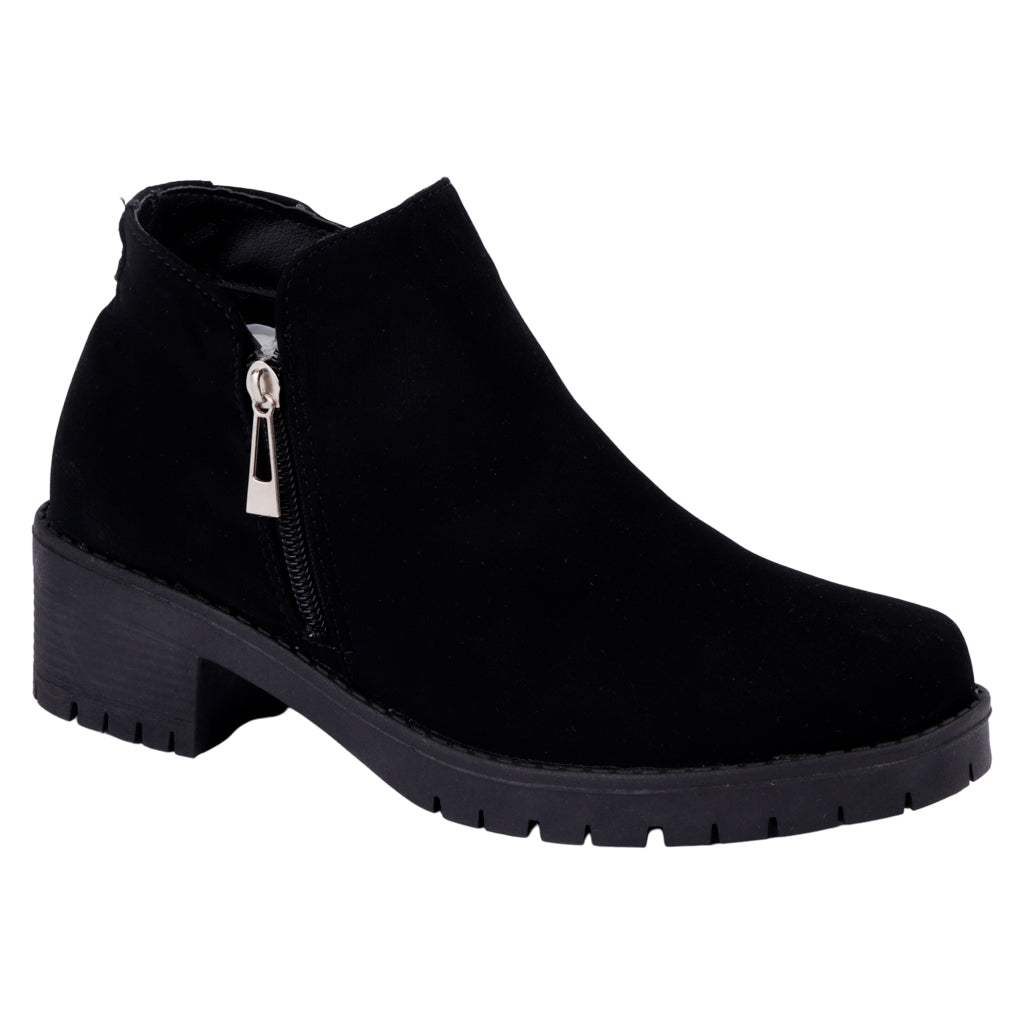 Los botines de dama son el calzado perfecto para cualquier época del año. Ya sea para el otoño o el invierno, su diseño atemporal y su comodidad te permitirán lucir chic en todo momento. Fratello botín para mujer en color negro, elaborado en material buck, tubo de 9 cm de altura y 30 cm de circunferencia, con cierre al tono en el lateral, suela sintética TR con tacón ancho de 4 cm, forro malla, tallas disponibles del 22 al 26, modelo con horma normal, adquirir talla habitual. Calza con estilo con Zapatería Fratello, calzado mexicano a la vanguardia, calidad y precio.