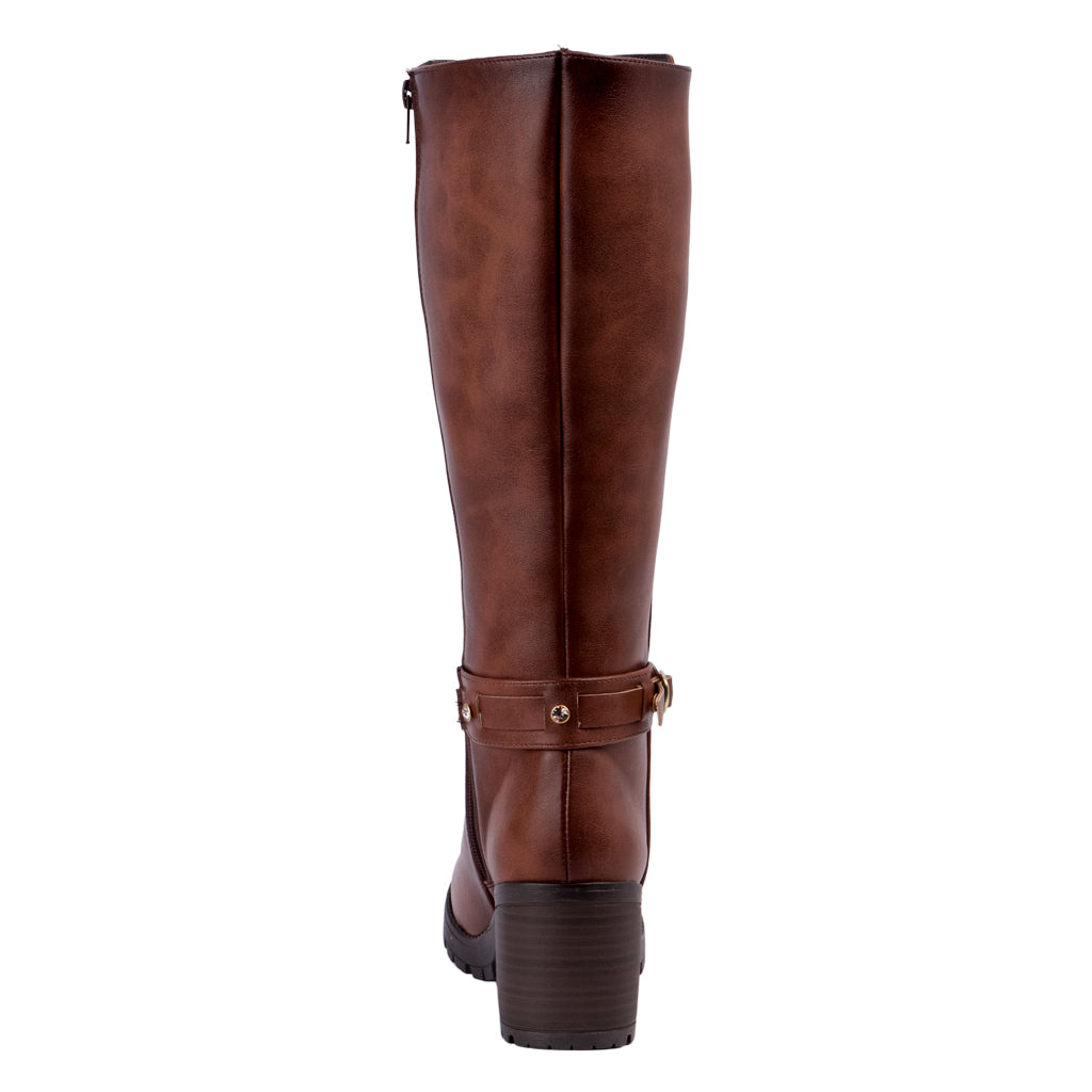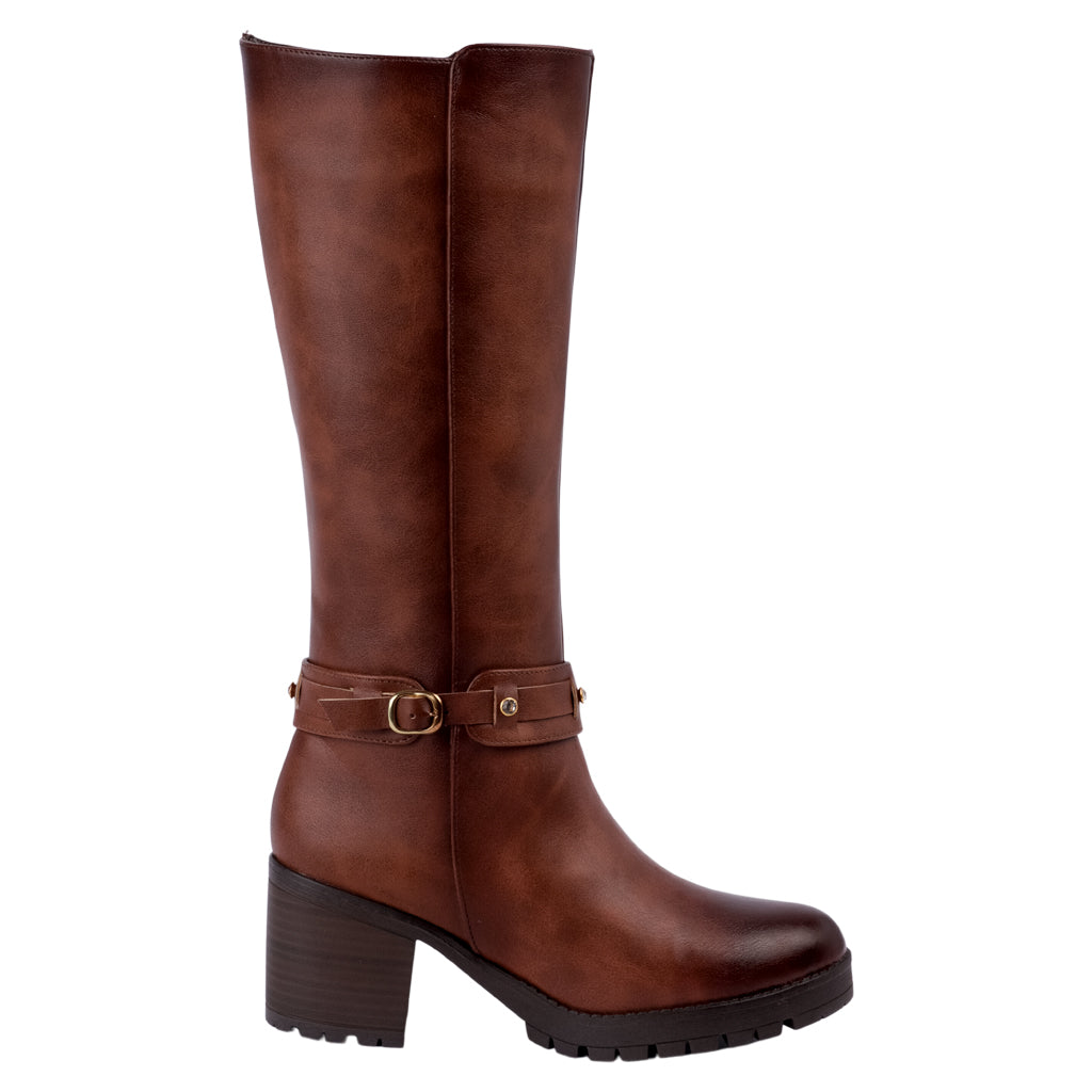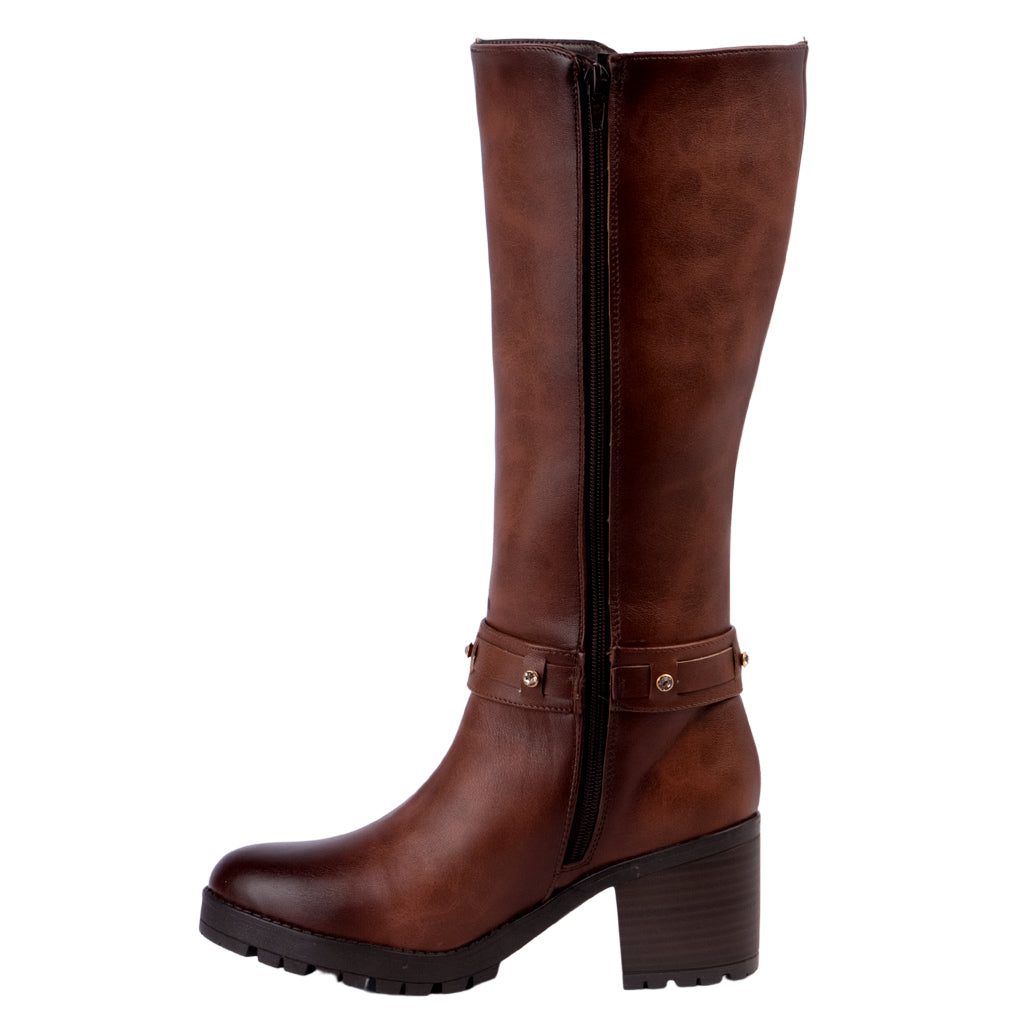 ¿Buscas un calzado que te permita lucir a la moda y a la vez mantenerte cómoda durante todo el día? Las botas de tubo alto casuales son la opción perfecta. Con su diseño moderno y suaves materiales, te permiten lucir elegante en cualquier situación y caminar durante horas sin cansarte. Fratello bota alta moderna para mujer, en color café, hecho en piel sintética en acabado napa, cuenta con interior confort, tipo de ajuste con cremallera completa en la parte lateral interna, diseño con una correa y hebilla e incrustaciones de pedrería para lucir más elegante, material de la suela sintética, cuanta con tacón ancho de 7 cm. de alto, forro sintético, tallas disponibles 22 al 26 incluyendo medios puntos, modelo con horma reducida, adquirir media talla más a la habitual. Calza con estilo con Zapatería Fratello, calzado mexicano a la vanguardia, calidad y precio.