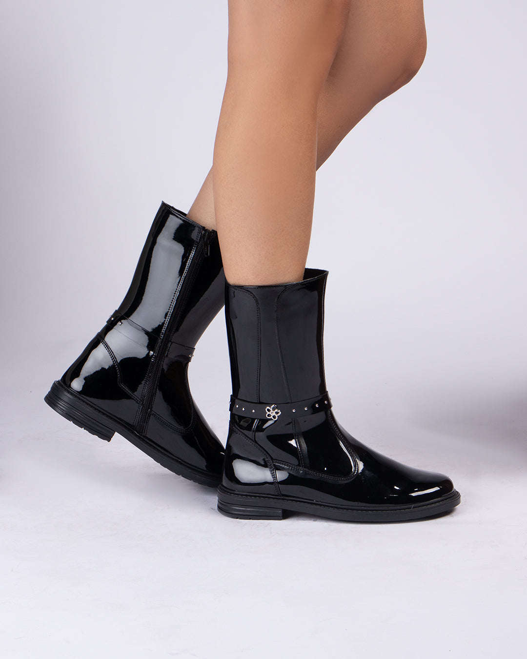 ¿Botas que combinan con todo? Fratello lo hace posible. Nuestras botas son tan versátiles como elegantes, perfectas para tu guardarropa de otoño e invierno. Con detalles que hacen la diferencia, te acompañan en todo momento. ¡Compra en línea y añade altura, estilo y calidez a tu look! Fratello bota para mujer, modelo en color negro, elaborado en material sintético charol, con herraje decorativo en color plateado, tubo de 24 cm de altura, y 32 cm de circunferencia, tipo de cierre con cremallera en lateral interno, suela sintética antideslizante, con tacón con un alto de 3 cm, forro sintético, tallas disponibles 22/25 incluyendo medias tallas, modelo con horma normal, adquirir talla habitual. Haz que cada paso cuente con Zapatería Fratello, calzado 100% mexicano. Ponte zapatos, no límites. Compra los tuyos ahora.