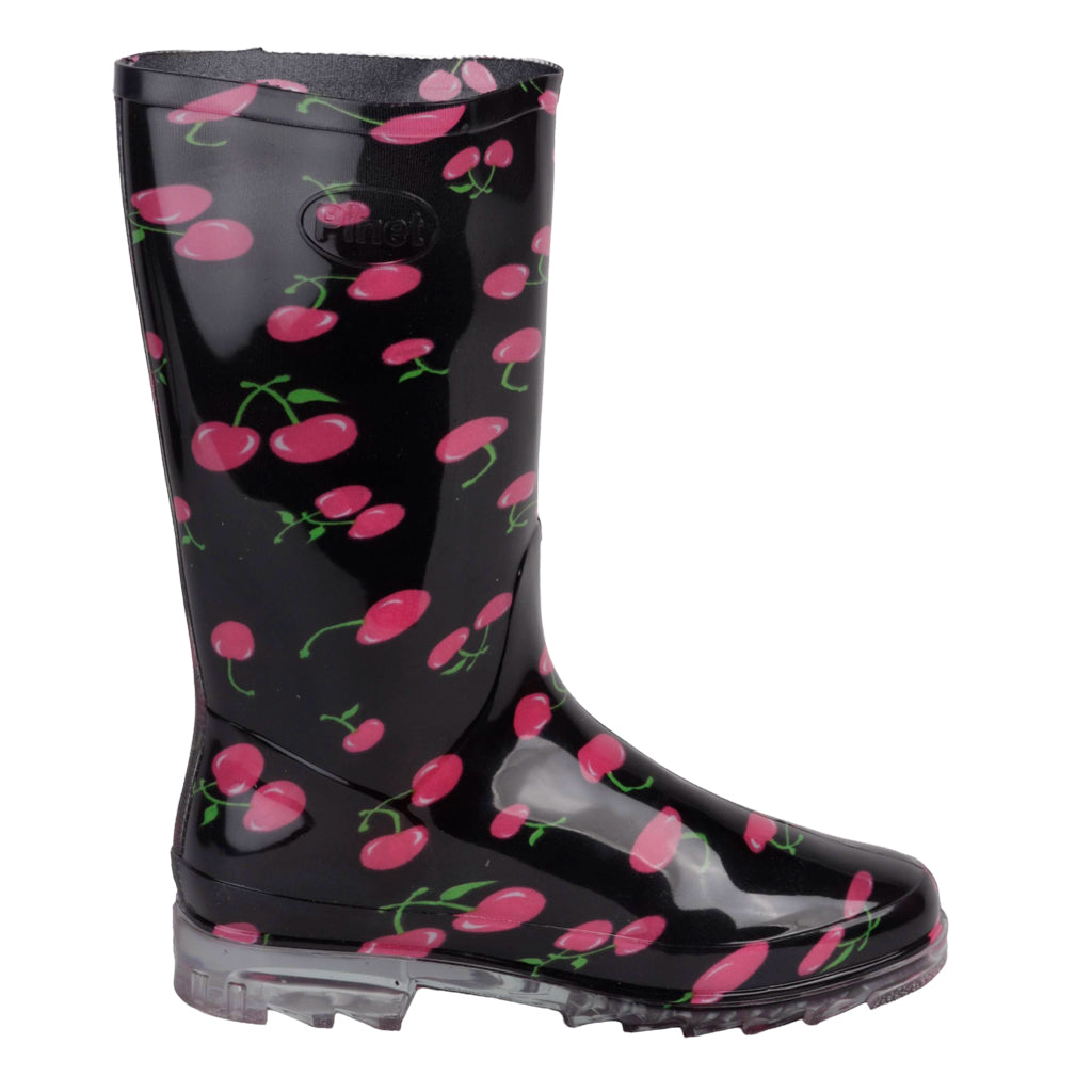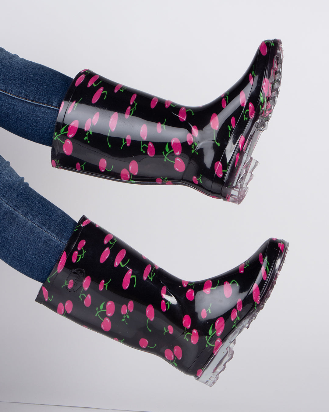 Enfrenta los días lluviosos con estilo y confianza con estas botas de lluvia Fratello modernas y cómodas. Su diseño práctico te mantiene seca sin perder el toque de moda que te encanta. Ligeras, flexibles y con ajuste cómodo, son perfectas para acompañarte en tus labores. Fratello botas para lluvia para mujer, en color negro con cerezas, modelo elaborado en material sintético, alto en tubo de 28 cm, circunferencia en caña alta de 42 cm, circunferencia en caña baja 33 cm, tipo de cierre slip on, suela sintética antideslizante, cuenta tacón de bloque con un alto de 2.5 cm forro sintético, tallas disponibles 23/26 no incluye medias tallas, te sugerimos adquirir tu talla habitual. Haz que cada paso cuente con Zapatería Fratello, calzado 100% mexicano. Ponte zapatos, no límites. Compra los tuyos ahora.