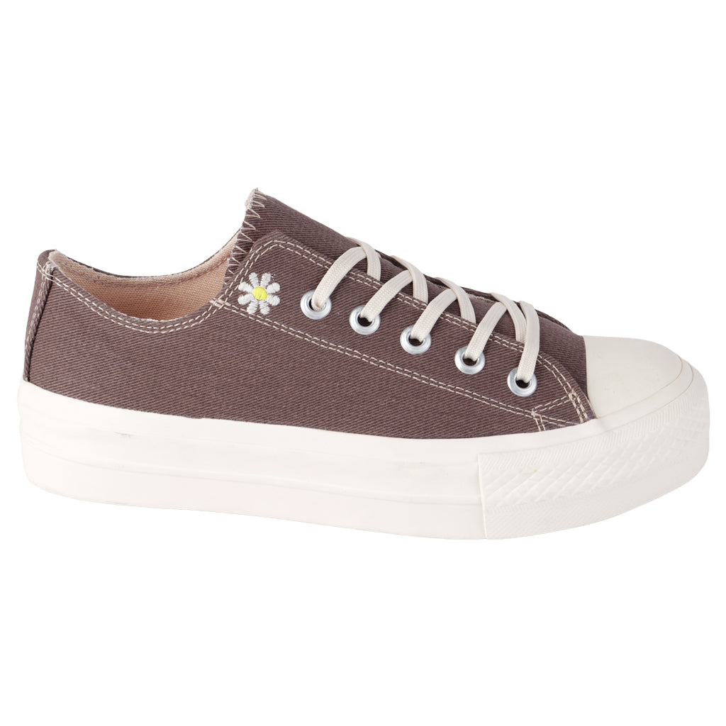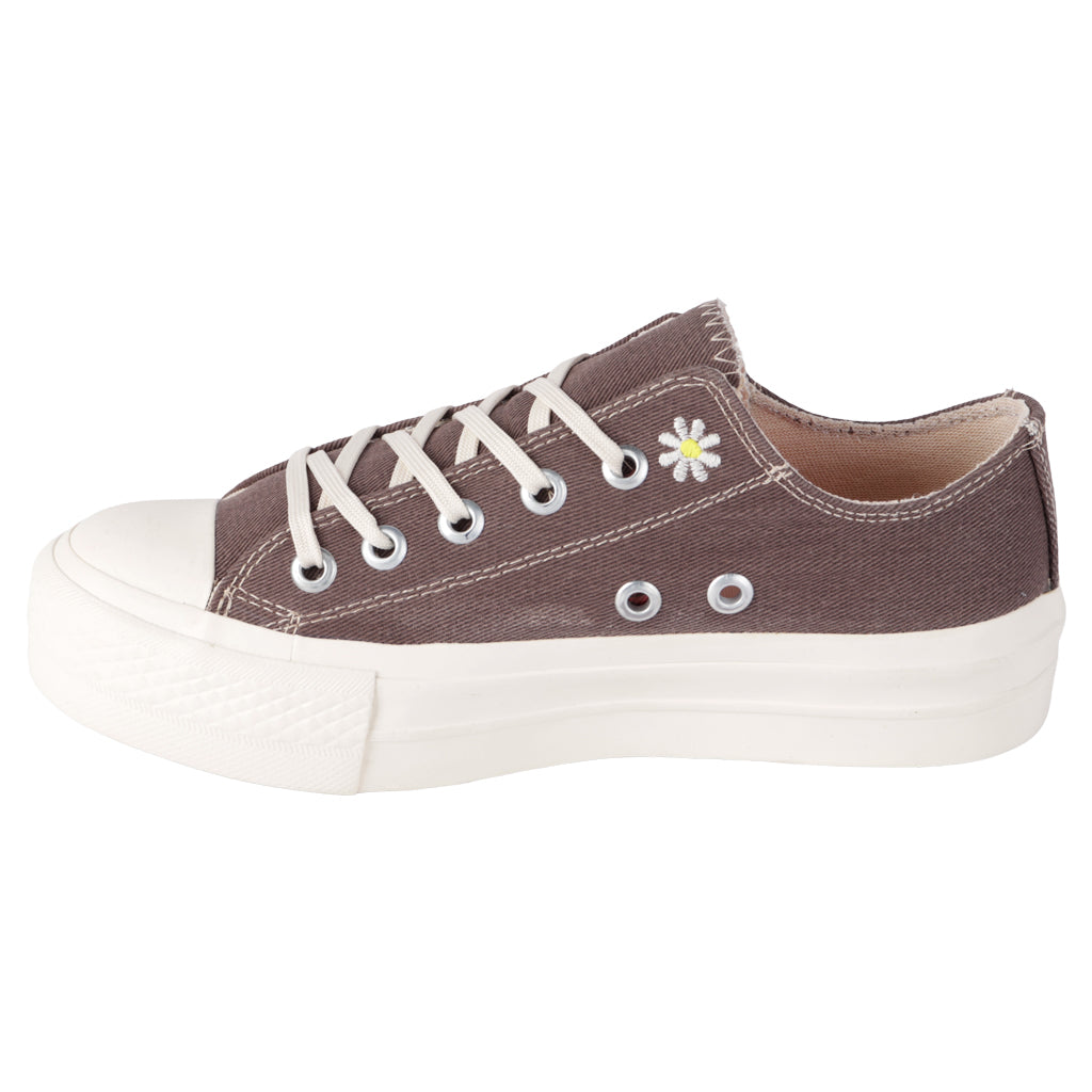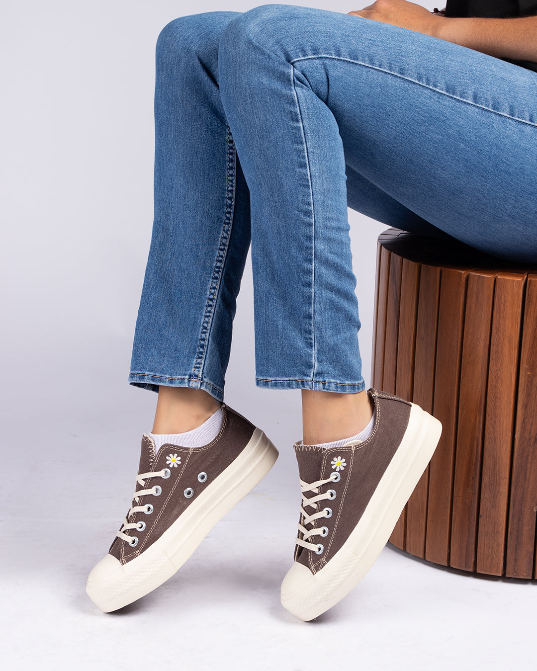 Tenis con personalidad. Fratello te ofrece modelos casuales con detalles únicos que marcan la diferencia. Ideales para el ritmo de la ciudad, para tu rutina o tus fines de semana. ¡Haz clic y encuentra tu próximo par infalible! Fratello tenis casuales para mujer, modelo en color café, elaborado en material lona, tipo de ajuste con agujetas color late, con detalle de bordado de margarita, suela sintética antideslizante con un alto de 4 cm, forro textil, tallas disponibles 22/26 incluyendo medias tallas, modelo con horma normal, adquirir talla habitual. Haz que cada paso cuente con Zapatería Fratello, calzado 100% mexicano. Ponte zapatos, no límites. Compra los tuyos ahora.