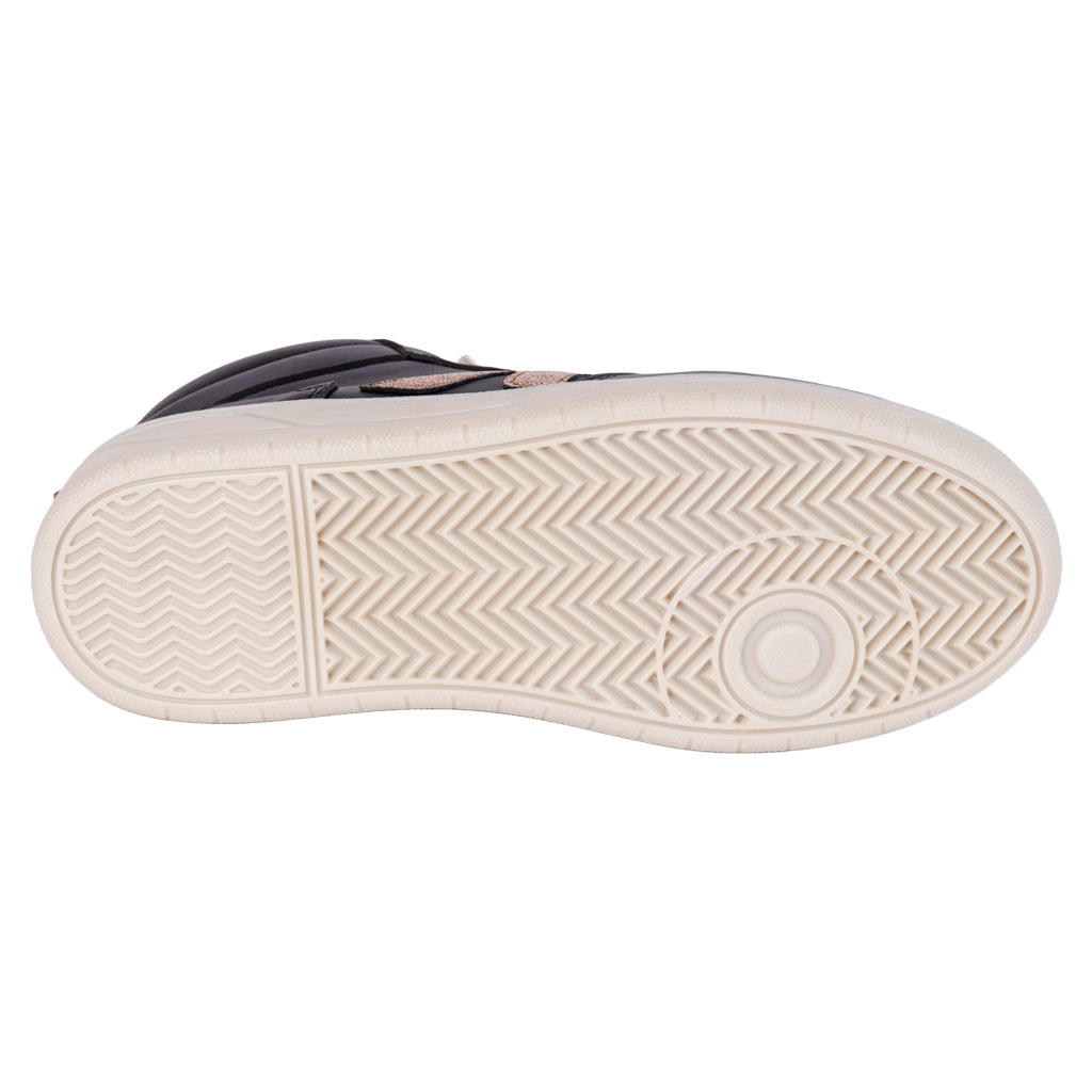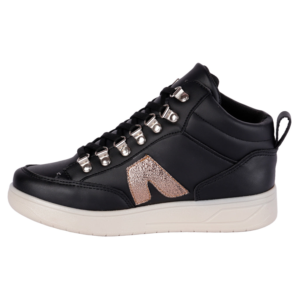 Tenis casual de bota para mujer en color negro al contraste del blanco, modelo hecho en material piel sintética, suela color blanco con un alto de 4 cm antiderrapante, modelo con agujetas en color negro, forro y platilla textiles, tallas disponibles del 23 al 26 incluyendo medios números, modelo con horma normal adquirir talla habitual, producto ligero. Productos mexicanos. Productos Fratello se distingue por su calidad y precios.