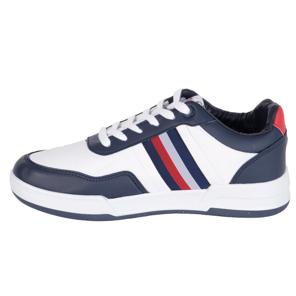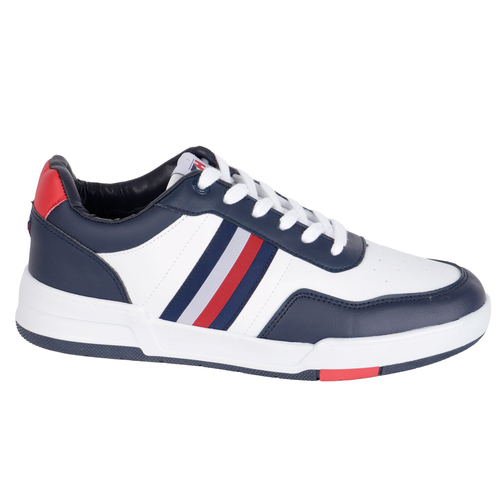 Innovación en Cada Diseño. En Zapatería Fratello, estamos constantemente innovando. Nuestros tenis casuales para caballero reflejan nuestro compromiso con la innovación, combinando las últimas tendencias con características funcionales. No te quedes atrás. Descubre los diseños innovadores de Fratello y marca tendencia en cada paso. Tommy Hill tenis casual para hombre, en color blanco en combinación con azul marino, modelo elaborado en material piel sintética, cuenta con diseño urbano y versátil, tipo de ajuste con agujetas, en tono blanco, suela en material sintético, en color blanco con azul y rojo, antideslizante, suela con un alto de 4 cm, forro textil, tallas disponibles 25 al 29.5 incluyendo medias tallas, modelo con horma normal (talla fiel), te sugerimos adquirir talla habitual. Haz que cada paso cuente con Zapatería Fratello, calzado 100% mexicano. Ponte zapatos, no límites. Compra los tuyos ahora.