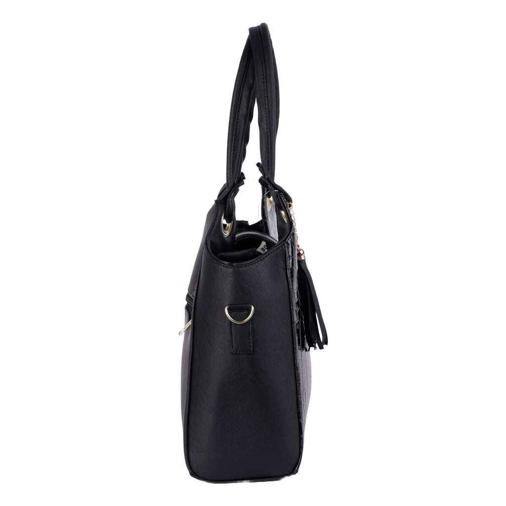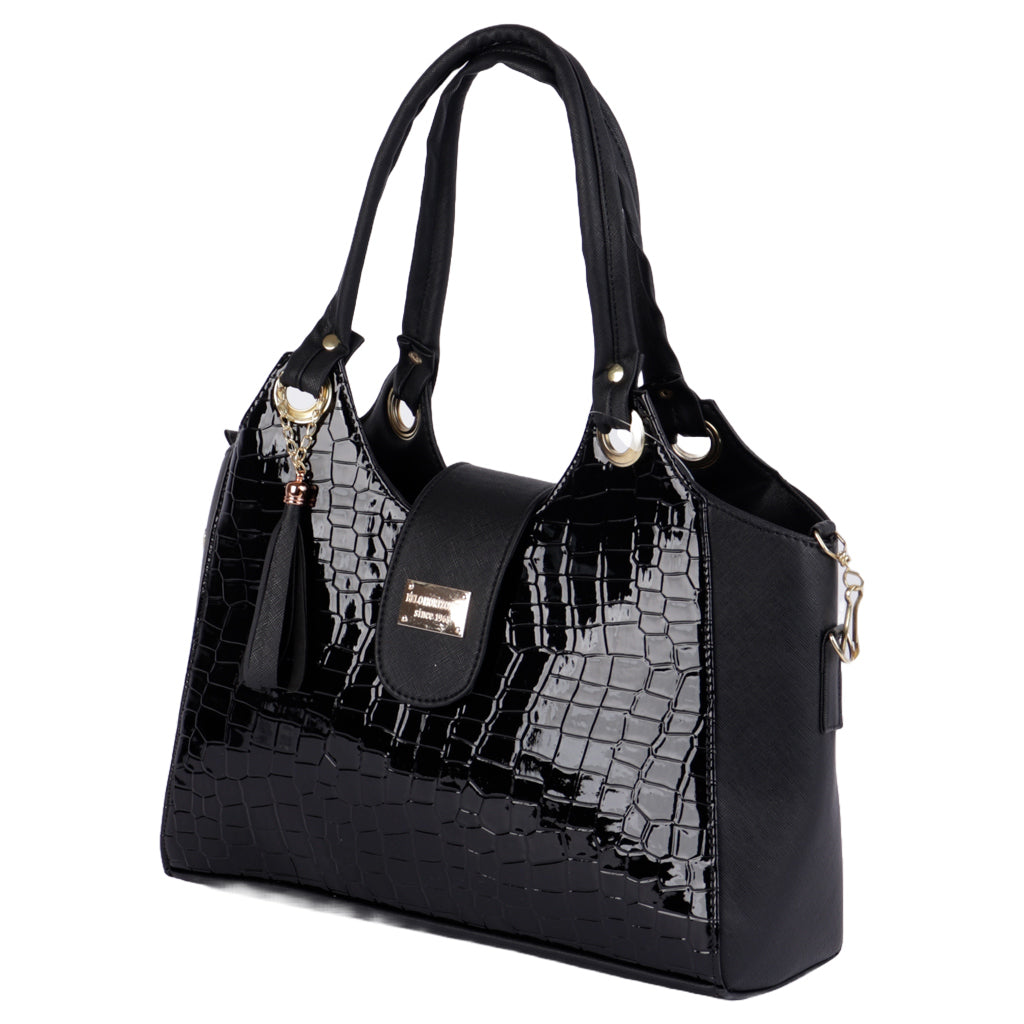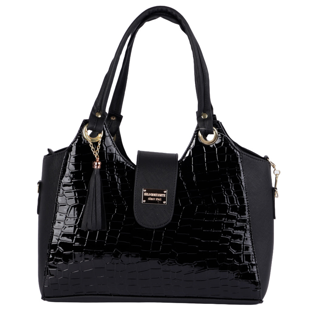 Lleva tu estilo al siguiente nivel con nuestros bolsos de mujer. Elige entre una amplia gama de modelos elegantes y a la moda. Perfectos para cualquier evento, desde casual hasta formal. ¡Compra ahora y complementa tu look con un bolso que marca tendencia. Fratello bolsa color negro para mujer, diseño texturizado elaborado en material charol, cuenta compartimento amplio interno con cremallera al tono y herraje color oro, así como una mini bolsa interna, y una bolsa mini externa, tipo de cierre con broche de presión, cómodo tirante ajustable desmontable, doble asa superior de transporte con detalle de borla al tono, forro textil, diseñada con una medida de 23 cm de alto x 34 cm de ancho y 12 cm de profundidad, con capacidad de 9.38 litros. Complementa tu estilo con accesorios de Zapatería Fratello, destacando la calidad y precio de la vanguardia mexicana.