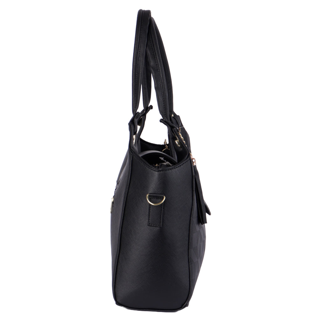 Los bolsos más elegantes del mercado están en nuestra tienda. Encuentra el estilo que más te guste y compra online ahora. ¡Agrégalo al carrito y recibe en casa rápidamente! Fratello bolsa color negro para mujer, diseño texturizado elaborado en material sintético, cuenta compartimento amplio interno con cremallera al tono y herraje color oro, así como una mini bolsa interna, y una bolsa mini externa, tipo de cierre con cremallera y broche de presión, cómodo tirante ajustable desmontable, doble asa superior de transporte con detalle de motita al tono, forro textil, diseñada con una medida de 23 cm de alto x 34 cm de ancho y 12 cm de profundidad, con capacidad de 9.38 litros. Complementa tu estilo con accesorios de Zapatería Fratello, destacando la calidad y precio de la vanguardia mexicana.