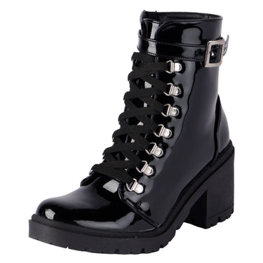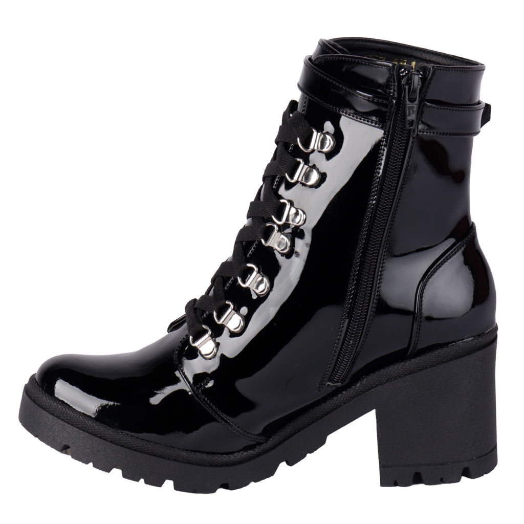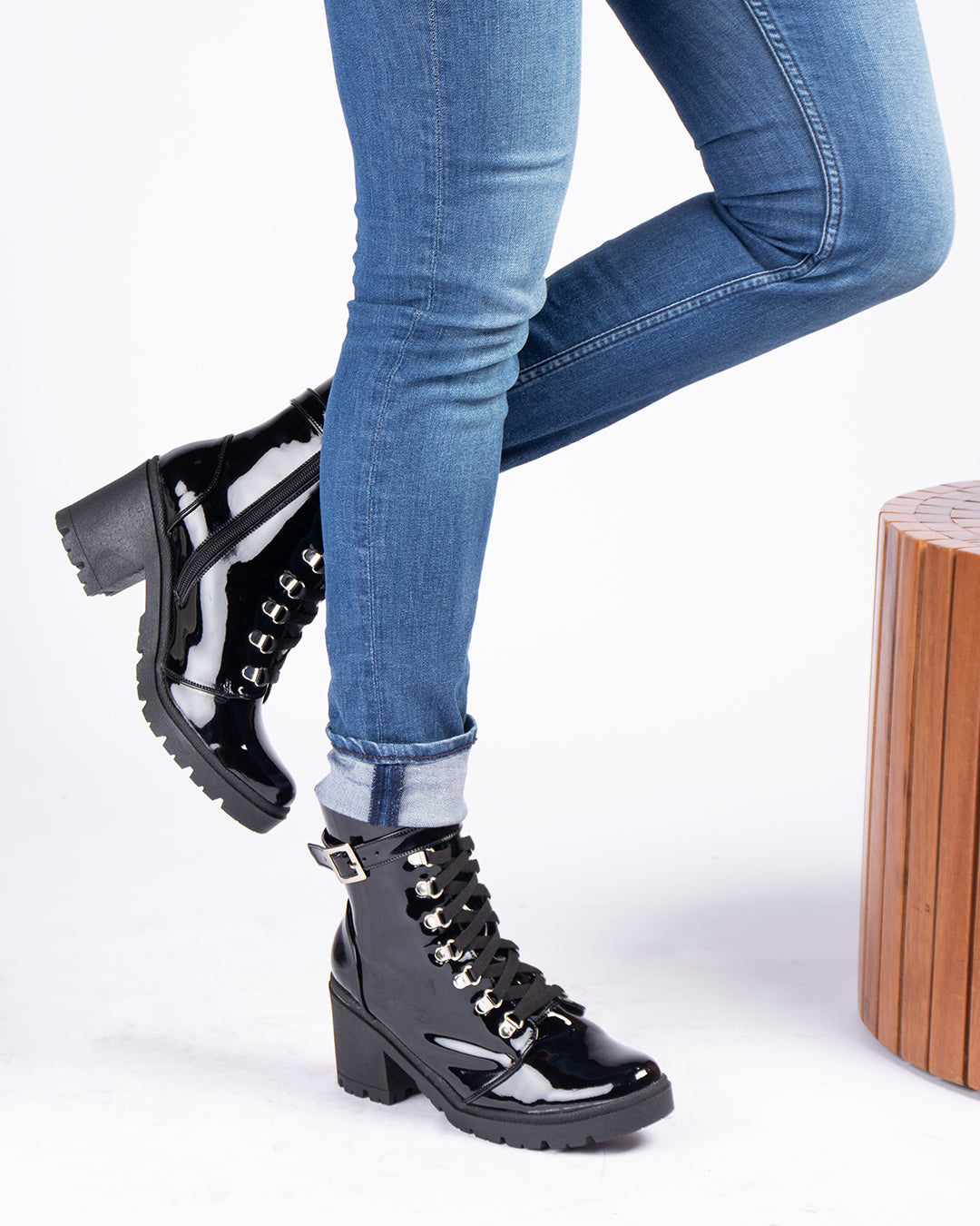 Con Fratello, cada día empieza con estilo. Las botas casuales para mujer están hechas para combinar con tus looks favoritos de temporada. Su diseño cómodo, cálido y versátil las convierte en el complemento ideal para el frío. ¡Haz clic y descubre el par que te acompañará todo el invierno! Fratello botas casuales para mujer, estilo combat, modelo en color negro, elaborado en material sintético charol, cuenta con pulsera con hebilla sin función de ajuste color plata, tubo de 14 cm de altura, y 30 cm de circunferencia, tipo de cierre con cremallera en lateral interno, con agujetas al tono, suela sintética antideslizante, tacón ancho con un alto de 8 cm, forro sintético, tallas disponibles 22/26 incluyendo medias tallas, modelo con horma normal, adquirir talla habitual. Haz que cada paso cuente con Zapatería Fratello, calzado 100% mexicano. Ponte zapatos, no límites. Compra los tuyos ahora.