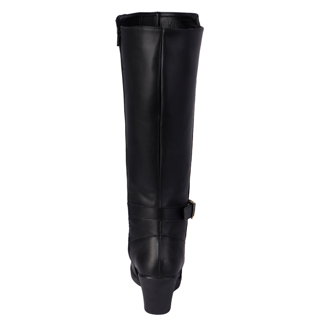 Este otoño-invierno, conquista las calles con las botas altas de Fratello. Su diseño elegante y moderno te ofrece soporte, abrigo y estilo en un solo calzado. Fáciles de combinar y perfectas para climas frescos. ¡Luce impecable y camina con seguridad en cualquier ocasión! Fratello bota alta para mujer, modelo en color negro, elaborado en material sintético, con hebilla sin función de ajuste en color oro, tubo de 38 cm de altura, y 40 cm de circunferencia, tipo de cierre con cremallera en lateral interno, suela sintética antideslizante, con tacón de cuña con un alto de 6 cm, forro sintético, tallas disponibles 22/26 incluyendo medias tallas, modelo con horma normal, adquirir talla habitual. Haz que cada paso cuente con Zapatería Fratello, calzado 100% mexicano. Ponte zapatos, no límites. Compra los tuyos ahora.