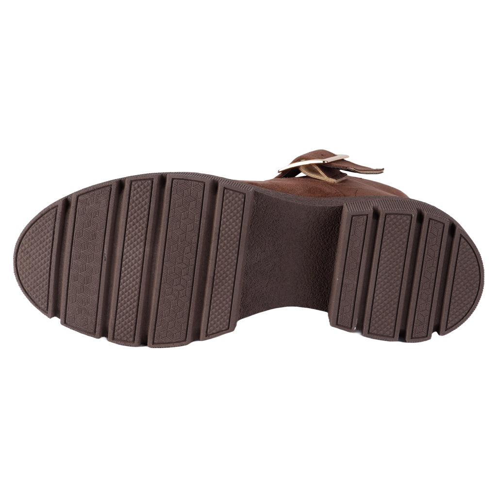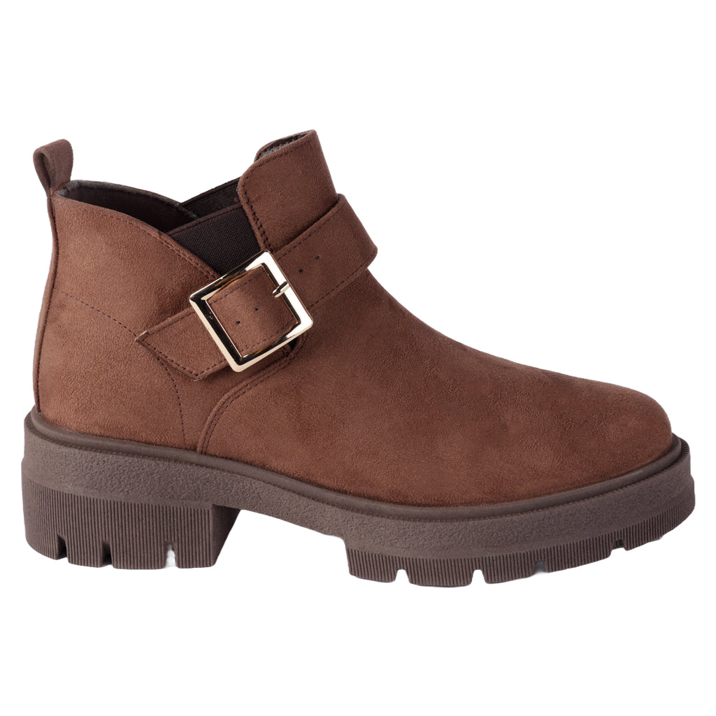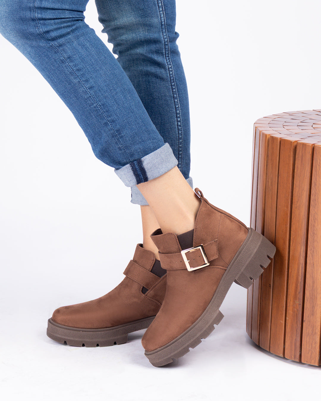 Tus looks merecen un toque especial, y los botines Fratello están listos para dártelo. Con un diseño que estiliza y protege, son perfectos para esta temporada. Combínalos con tonos neutros, tejidos gruesos o capas largas. ¡Luce increíble sin esfuerzo y compra online tu nuevo par favorito! Fratello botines para mujer, modelo en color café, elaborado en material sintético acabado suave al tacto, con elástico al tono en los laterales, con hebilla color oro sin función de ajuste, tubo de 9 cm de altura, y 28 cm de circunferencia, tipo de cierre pull on, suela sintética antideslizante, con tacón ancho con un alto de 5 cm, forro textil, tallas disponibles 23/26 incluyendo medias tallas, modelo con horma normal, adquirir talla habitual. Haz que cada paso cuente con Zapatería Fratello, calzado 100% mexicano. Ponte zapatos, no límites. Compra los tuyos ahora.