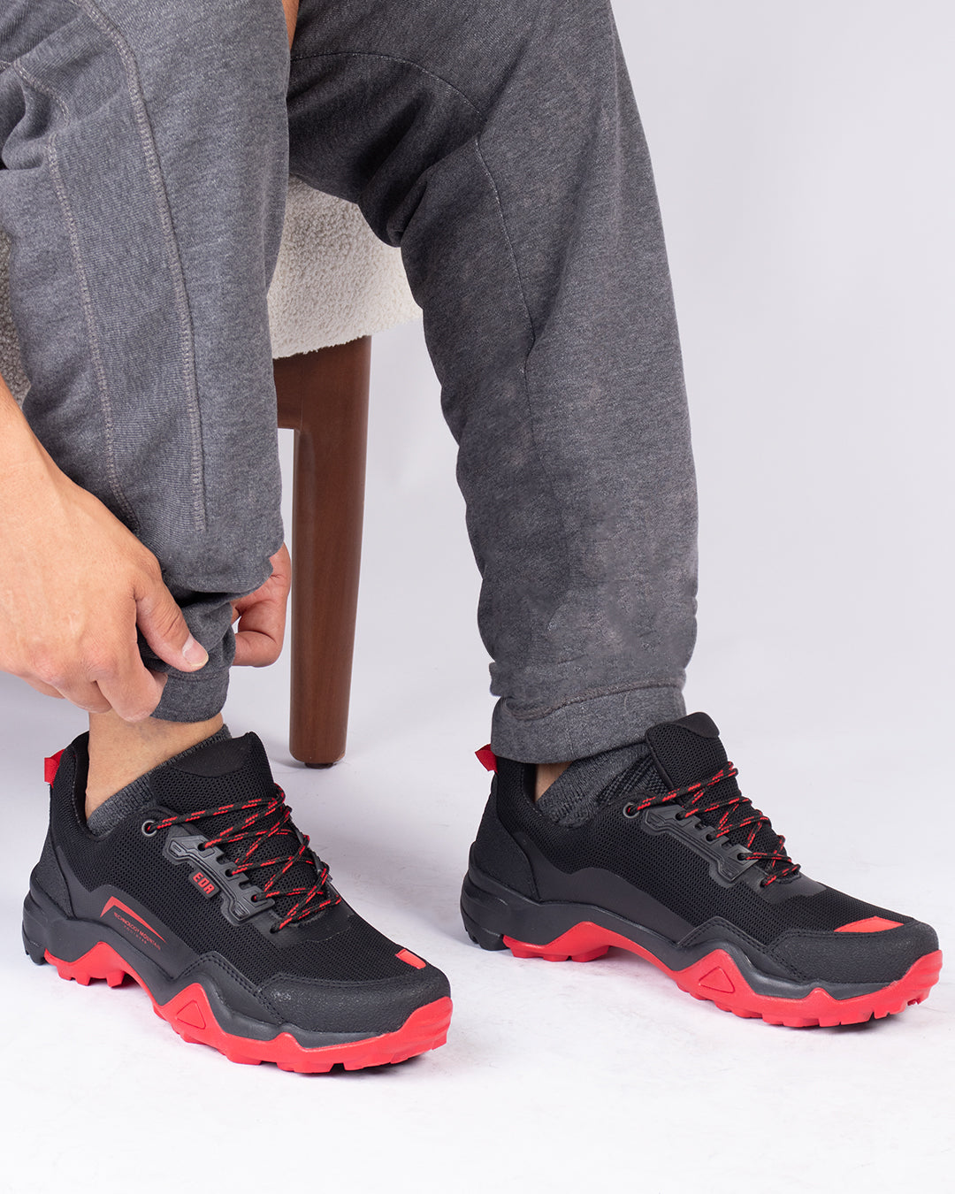 El sendero es tuyo. Las botas de senderismo Fratello combinan durabilidad y agarre con un diseño pensado para largas distancias. Estables, ligeras y resistentes, te acompañan en cada paso. ¡Compra ahora y aventúrate sin preocuparte por tus pies! Fratello bota de senderismo para hombre, en color negro/rojo, modelo elaborado en textil, cuenta con tipo de cierre con cordones en tono bicolor café y beige, suela sintética de tr antideslizante, cuenta con suela plana, con un alto de 4 cm forro textil, tallas disponibles 25/29 incluyendo medias tallas, modelo con horma normal (talla fiel), te sugerimos adquirir talla habitual. Haz que cada paso cuente con Zapatería Fratello, calzado 100% mexicano. Ponte zapatos, no límites. Compra los tuyos ahora.