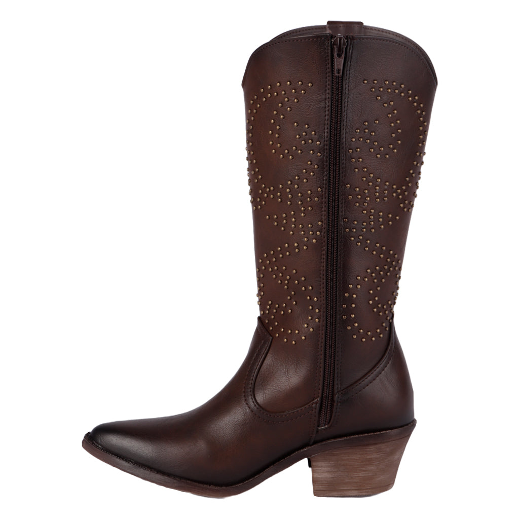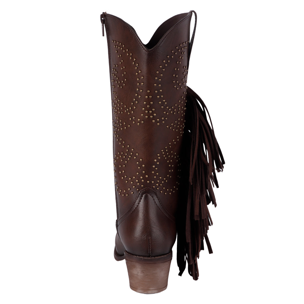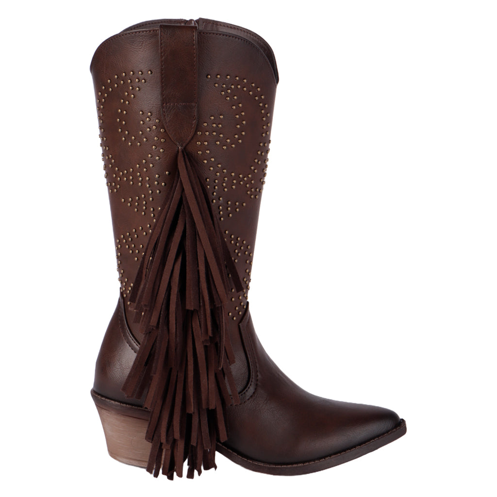 Las botas vaqueras Fratello para mujer combinan tradición y estilo moderno. Su diseño con bordados únicos y tacón bajo las convierte en el calzado perfecto para lucir auténtica sin renunciar a la comodidad. Úsalas con jeans o vestidos y destaca esta temporada con un look western irresistible. Fratello bota vaquera para mujer, modelo en color café, elaborado en material sintético, tubo de 31 cm de altura, y 36 cm de circunferencia, cuenta con flecos en el tubo y diseño de estoperoles, tipo de cierre con cremallera en lateral interno, al tono café, suela sintética con un alto de 5 cm, forro textil, tallas disponibles 23/27 incluyendo medias tallas, modelo con horma reducida, adquirir medio punto más para mayor comodidad. Haz que cada paso cuente con Zapatería Fratello, calzado 100% mexicano. Ponte zapatos, no límites. Compra los tuyos ahora.