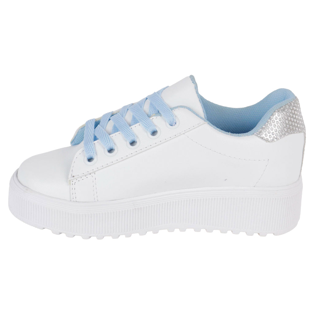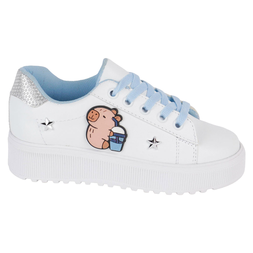 Fratello tenis casual para niña, en color blanco y azul cielo, modelo elaborado en material sintético, cuenta con aplicación de imagen capibara y estoperoles de estrella, tipo de cierre con agujetas en tono azul cielo, suela sintética ranil, antideslizante, cuenta con suela plana, con un alto de 3 cm forro sintético, tallas disponibles 18.21.5 incluyendo medias tallas, modelo con horma normal (talla fiel), te sugerimos adquirir talla habitual. Haz que cada paso cuente con Zapatería Fratello, calzado 100% mexicano. Ponte zapatos, no límites. Compra los tuyos ahora.