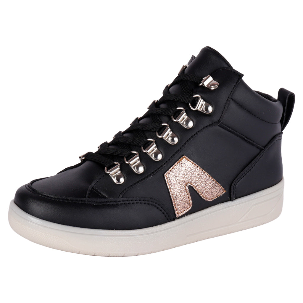 Tenis casual de bota para mujer en color negro al contraste del blanco, modelo hecho en material piel sintética, suela color blanco con un alto de 4 cm antiderrapante, modelo con agujetas en color negro, forro y platilla textiles, tallas disponibles del 23 al 26 incluyendo medios números, modelo con horma normal adquirir talla habitual, producto ligero. Productos mexicanos. Productos Fratello se distingue por su calidad y precios.