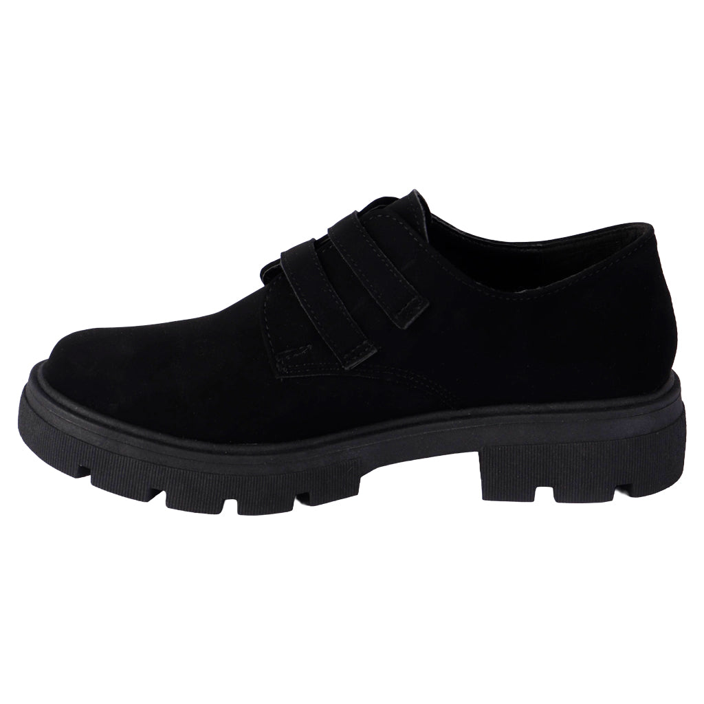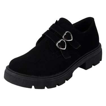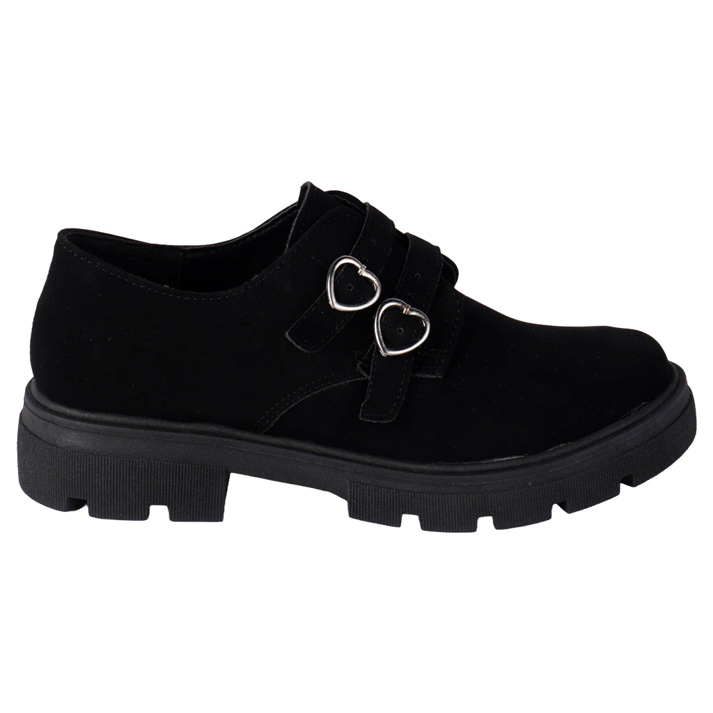 Diseñados para mujeres que aman verse bien sin complicarse. Los zapatos casuales Fratello combinan líneas limpias y estilo urbano para complementar tu look diario. ¡Agrégalos a tu colección y camina con ligereza y seguridad! Fratello zapatos casuales para mujer, modelo en color negro, elaborado en material sintético buck, tipo de ajuste con hebillas en forma de corazón color plata, suela sintética antideslizante, suela con un alto de 4 cm, forro sintético, tallas disponibles 22/26 incluyendo medias tallas, modelo con horma normal, adquirir talla habitual. Haz que cada paso cuente con Zapatería Fratello, calzado 100% mexicano. Ponte zapatos, no límites. Compra los tuyos ahora.