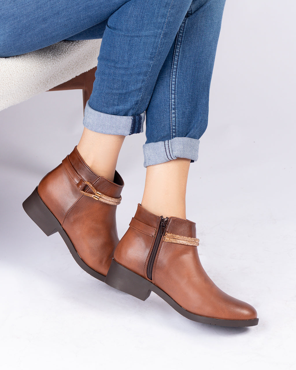 Unos buenos botines transforman cualquier outfit. Fratello te ofrece modelos con estilo, diseño funcional y materiales duraderos. Camina segura en los días fríos y complementa tu look con un calzado que lo dice todo. ¡Compra online y prepárate para llevar tu estilo al siguiente nivel! Fratello botín casual para mujer, en color tan, modelo elaborado en material sintético, tubo de 10 cm de altura, y 28 cm de circunferencia, cuenta con pulsera con aplicación de pedrería al tono, tipo de cierre con cremallera en lateral interno, al tono suela sintética pv, cuenta con tacón de bloque, con un alto de 4 cm forro sintético, tallas disponibles 23/26 incluyendo medias tallas, modelo con horma reducida, adquirir medio punto más para mayor comodidad. Haz que cada paso cuente con Zapatería Fratello, calzado 100% mexicano. Ponte zapatos, no límites. Compra los tuyos ahora.